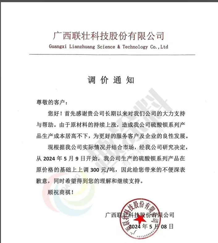 近日,廣西聯(lián)壯科技股份有限公司也對(duì)外發(fā)布《調(diào)價(jià)通知》指出,由于原材料的持續(xù)上漲,造成公司硫酸鋇系列產(chǎn)品生產(chǎn)成本居高不下,為更好的服務(wù)客戶及企業(yè)的良性發(fā)展?,F(xiàn)根據(jù)公司實(shí)際情況并結(jié)合市場(chǎng),經(jīng)公司研究決定從2024年5月9日開始,公司生產(chǎn)的硫酸鋇系列產(chǎn)品在原價(jià)格的基礎(chǔ)上上調(diào)300元/噸。