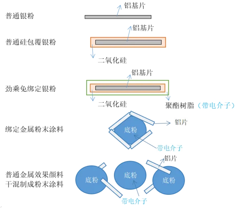 在硅包覆的鋁片基礎(chǔ)上再包覆聚酯樹脂,這與我們粉末涂料的透明底粉類似,這個(gè)聚酯樹脂有非常好的穩(wěn)定的帶電性,聚槍風(fēng)險(xiǎn)低,即使添加量較大也不聚槍,同時(shí)顏色很均勻。可以不用綁定,直接干混使用。因?yàn)榻饘俜郾砻嬗幸粚泳埘渲?,?dāng)金屬粉噴到被施工物件后,高溫熔融成膜的時(shí)候,金屬顏料表面包覆的聚酯樹脂會(huì)參與成膜,將銀粉牢牢的固定在漆膜中,銀粉表面成膜的樹脂也給漆膜帶來超流平和優(yōu)異的高光澤,從而避免了掉銀、手印等現(xiàn)象。銀粉表面樹脂成膜的機(jī)理本質(zhì)上和油漆的罩光是一個(gè)道理。油漆的金屬漆施工后,往往會(huì)再噴一道透明的清漆,這就是罩光過程,從而保護(hù)金屬漆層不被腐蝕破壞等,這個(gè)可以參考汽車漆施工。