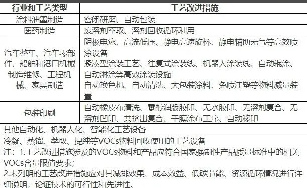 通過工藝改進(jìn),淘汰老舊落后工藝設(shè)備,采用具有高質(zhì)量發(fā)展和減排協(xié)同性的先進(jìn)工藝,減少單位產(chǎn)量的涉VOCs物料耗用量,提高生產(chǎn)效率,減少資源浪費(fèi)。本市常見行業(yè)和工藝的VOCs源頭減排工藝改進(jìn)措施如下: