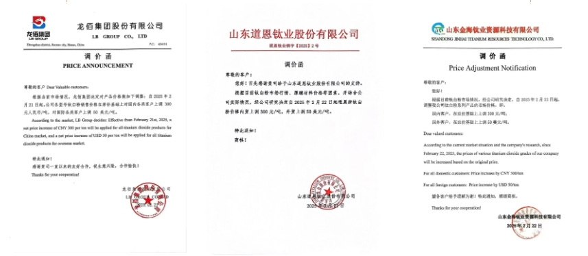 此外,鈦白粉的價格也呈現(xiàn)上漲態(tài)勢。近期,龍柏集團再次領(lǐng)漲,惠云鈦業(yè)、海峰鑫、山東東佳等十幾家鈦白粉企業(yè)在一周之內(nèi)集體發(fā)函宣布漲價,掀起了年內(nèi)第二波集體漲價潮。國內(nèi)鈦白粉價格普遍上漲300元/噸,海外價格普遍上漲50美元/噸。而在春節(jié)前夕的一月下旬,鈦白粉行業(yè)也曾進行過集體價格調(diào)整。兩次累計來看,國內(nèi)鈦白粉銷售價格最高上漲了1100元/噸,海外價格最高調(diào)漲了150美元/噸。