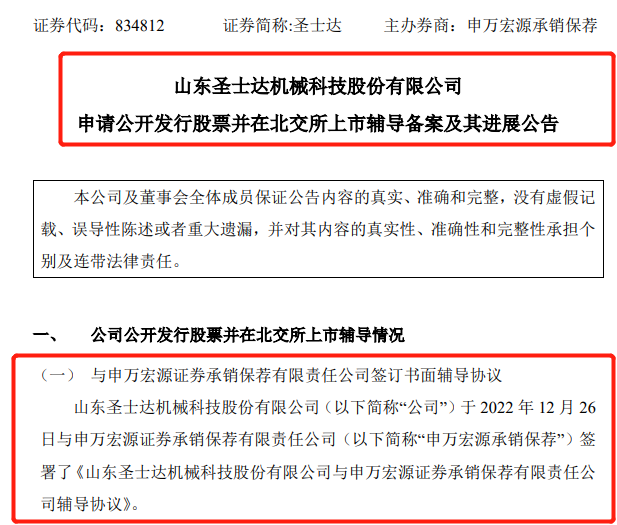 公告中指出,圣士達于12月26日與申萬宏源證券承銷保薦有限責任公司(簡稱:申萬宏源證券)簽署了《山東圣士達機械科技股份有限公司與申萬宏源證券承銷保薦有限責任公司輔導協(xié)議》。