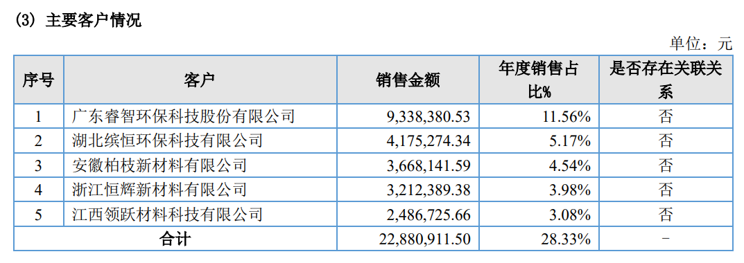粉末涂裝機(jī)械銷售是公司目前業(yè)務(wù)收入的主要來源。根據(jù)披露,圣士達(dá)2022年主要客戶有廣東睿智環(huán)??萍脊煞萦邢薰荆?33.84萬元)、湖北繽恒環(huán)??萍加邢薰荆?17.53萬元)、安徽柏枝新材料有限公司(366.81萬元)、浙江恒輝新材料有限公司(321.24萬元)、江西領(lǐng)躍材料科技有限公司(248.67萬元)。