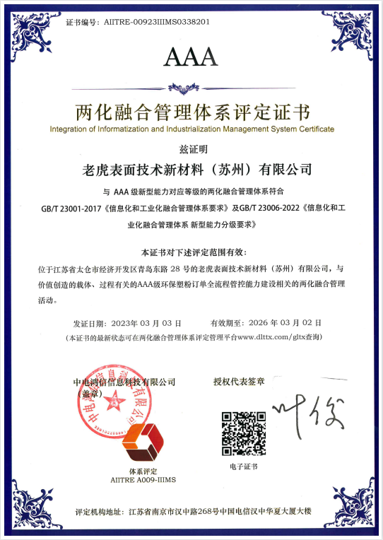 近日,TIGER打造的「環(huán)保塑粉訂單全流程管控能力」順利通過信息化和工業(yè)化管理體系認證,獲得AAA級評定證書。AAA級是目前兩化融合管理體系可申請的最高等級認證,目前江蘇太倉市獲得兩化融合AAA級認證的公司僅有十家。此次評定的通過,標志著TIGER數字化轉型工作和行業(yè)智能化制造水平再次獲得權威認可,是對企業(yè)綜合發(fā)展?jié)摿Φ木薮罂隙ā?/p>