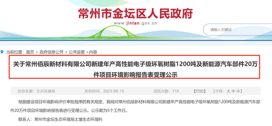 近日,江蘇省常州市金壇生態(tài)環(huán)境局對外發(fā)布《關(guān)于常州佰辰新材料有限公司新建年產(chǎn)高性能電子級環(huán)氧樹脂1200噸及新能源汽車部件20萬件項(xiàng)目環(huán)境影響報告表受理公示》。