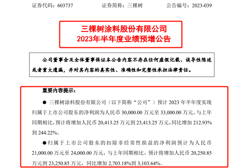 2023年7月7日,三棵樹涂料股份有限公司(簡稱“三棵樹”)發(fā)布半年度業(yè)績預(yù)增公告,預(yù)計(jì)2023年半年度實(shí)現(xiàn)歸屬于上市公司股東的凈利潤為3億元-3.3億元,同比增加212.93%-244.22%。歸屬于上市公司股東的扣除非經(jīng)常性損益的凈利潤預(yù)計(jì)為2.1億元至2.4億元,與上年同期相比,同比增加2703.18%到3103.64%。