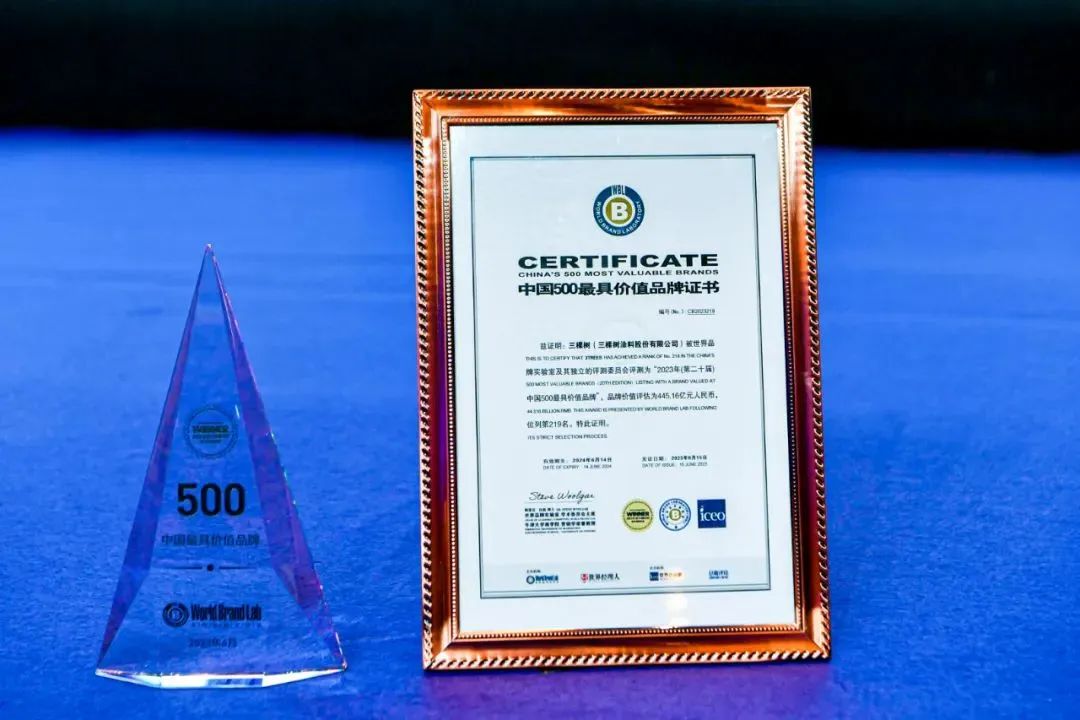 6月15日,由世界品牌實(shí)驗(yàn)室(World Brand Lab)主辦的第二十屆“世界品牌大會”在北京舉行,會上發(fā)布了2023年《中國500最具價(jià)值品牌》分析報(bào)告。三棵樹以445.16億元的品牌價(jià)值,第17次榮登“中國500最具價(jià)值品牌排行榜”, 較去年增長64.48億元,增幅達(dá)16.94%,持續(xù)蟬聯(lián)涂料榜單第一名。