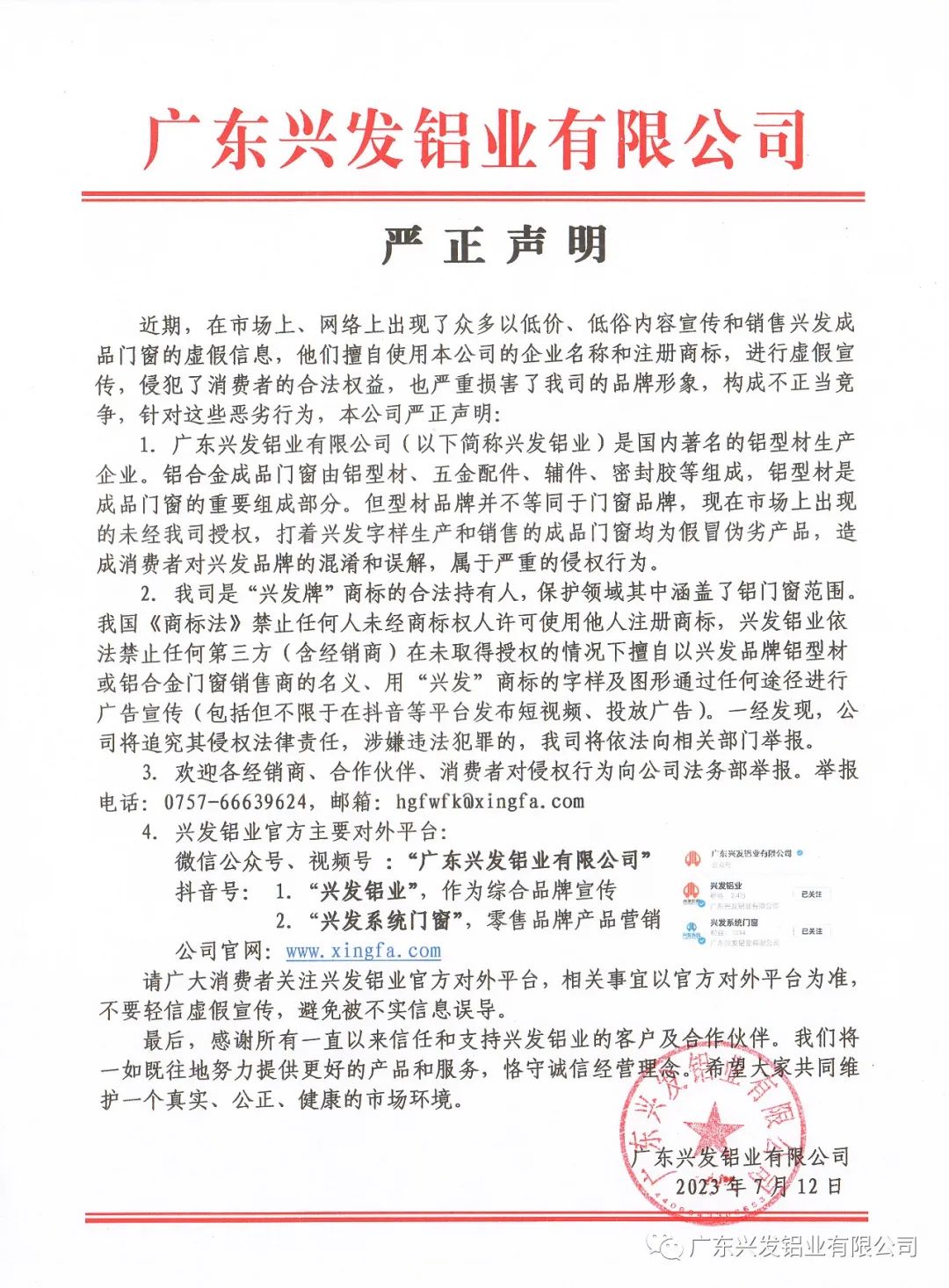 2023年7月12日,興發(fā)鋁業(yè)官微對(duì)外發(fā)布《嚴(yán)正聲明》。聲明中指出,“近期,在市場(chǎng)上、網(wǎng)絡(luò)上出現(xiàn)了眾多以低價(jià)、低俗內(nèi)容宣傳和銷售興發(fā)成品門(mén)窗的虛假信息,他們擅自使用本公司的企業(yè)名稱和注冊(cè)商標(biāo),進(jìn)行虛假宣傳,侵犯了消費(fèi)者的合法權(quán)益,也嚴(yán)重?fù)p害了我司的品牌形象,構(gòu)成不正當(dāng)競(jìng)爭(zhēng)。”