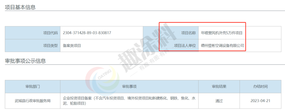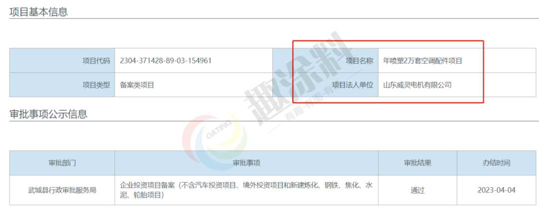 2023年4月4日,山東威靈電機(jī)有限公司,年噴塑2萬套空調(diào)配件項(xiàng)目,在武城縣行政審批服務(wù)局,進(jìn)行企業(yè)投資項(xiàng)目備案(不含汽車投資項(xiàng)目、境外投資項(xiàng)目和新建煉化、鋼鐵、焦化、水泥、輪胎項(xiàng)目)。