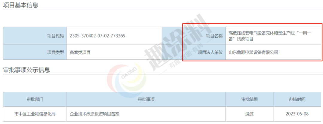 2023年5月8日,山東魯源電器設(shè)備有限公司,高低壓成套電氣設(shè)備殼體噴塑生產(chǎn)線“一用一備”技改項(xiàng)目,在市中區(qū)工業(yè)和信息化局,進(jìn)行企業(yè)技術(shù)改造投資項(xiàng)目備案。
