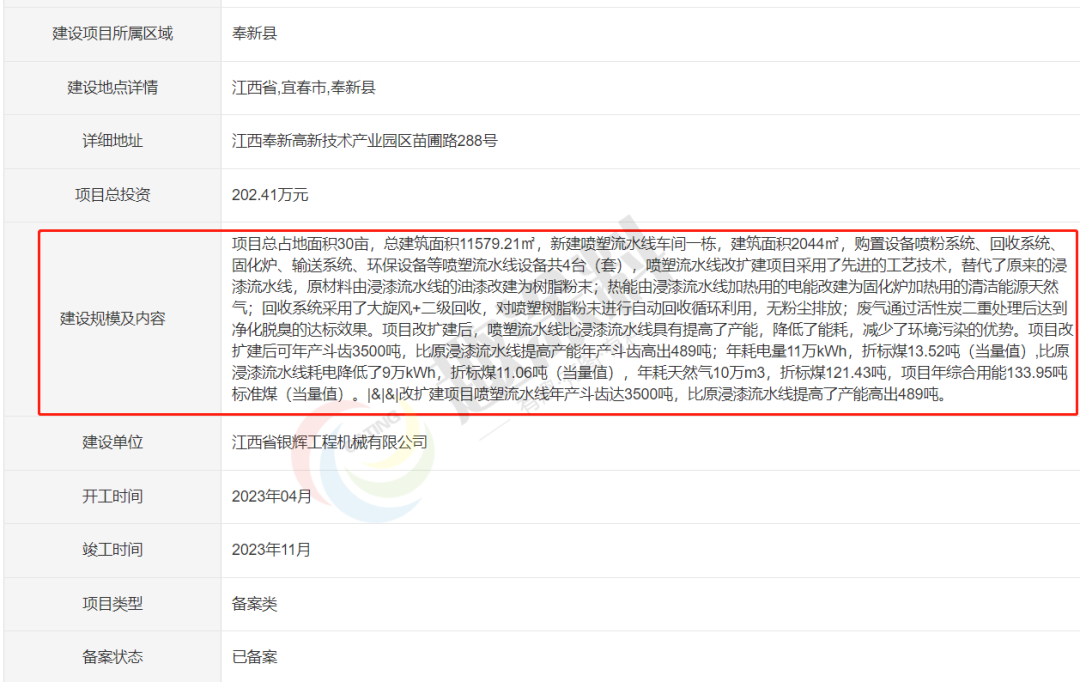 2023年4月26日,江西省銀輝工程機(jī)械有限公司,噴塑流水線改擴(kuò)建項(xiàng)目,進(jìn)行企業(yè)項(xiàng)目備案。