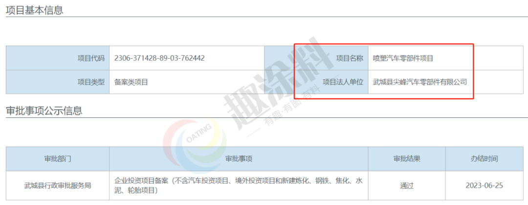 2023年6月20日,武城縣尖峰汽車零部件有限公司,噴塑汽車零部件項(xiàng)目,在武城縣行政審批服務(wù)局,進(jìn)行企業(yè)投資項(xiàng)目備案(不含汽車投資項(xiàng)目、境外投資項(xiàng)目和新建煉化、鋼鐵、焦化、水泥、輪胎項(xiàng)目)。