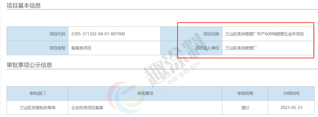 2023年5月19日,蘭山區(qū)美涂噴塑廠,年產(chǎn)600噸噴塑五金件項(xiàng)目,在蘭山區(qū)發(fā)展和改革局,進(jìn)行企業(yè)投資項(xiàng)目備案。