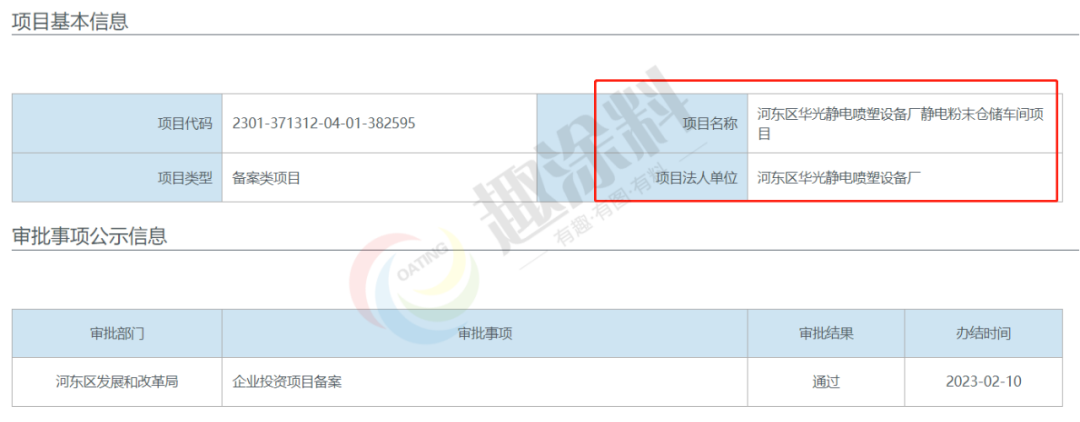2023年1月6日,河?xùn)|區(qū)華光靜電噴塑設(shè)備廠,靜電粉末倉儲車間項(xiàng)目,在河?xùn)|區(qū)發(fā)展和改革局,進(jìn)行企業(yè)投資項(xiàng)目備案。