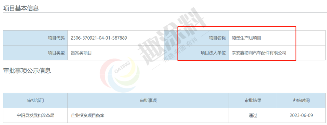 2023年6月8日,泰安鑫德潤汽車配件有限公司,噴塑生產(chǎn)線項(xiàng)目,在寧陽縣發(fā)展和改革局,進(jìn)行企業(yè)投資項(xiàng)目備案。
