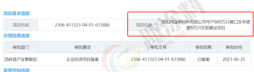 2023年6月25日,南陽鳴澤新材料有限公司,年產(chǎn)800萬只冒口及年噴塑8萬只支架建設(shè)項(xiàng)目,在西峽縣產(chǎn)業(yè)集聚區(qū),進(jìn)行企業(yè)投資項(xiàng)目備案。