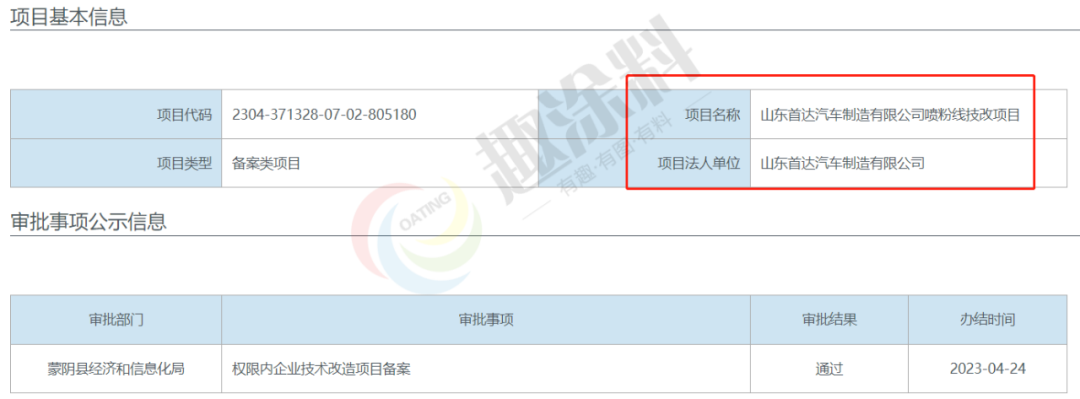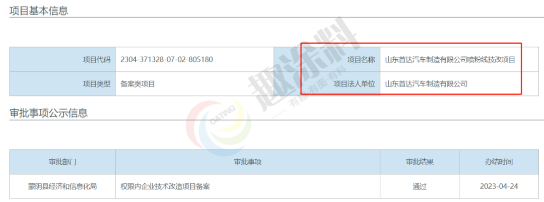 2023年4月21日,山東首達(dá)汽車制造有限公司,噴粉線技改項(xiàng)目,在蒙陰縣經(jīng)濟(jì)和信息化局,進(jìn)行權(quán)限內(nèi)企業(yè)技術(shù)改造項(xiàng)目備案。