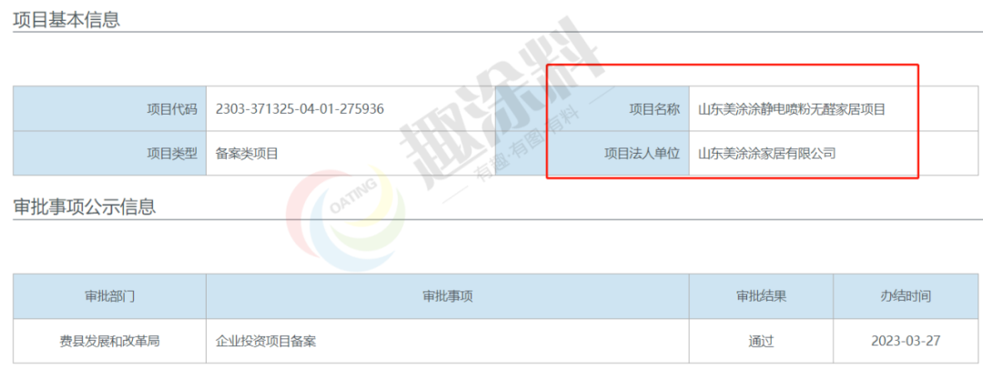 2023年3月26日,山東美涂涂家居有限公司,涂靜電噴粉無醛家居項(xiàng)目,在費(fèi)縣發(fā)展和改革局,進(jìn)行企業(yè)投資項(xiàng)目備案。