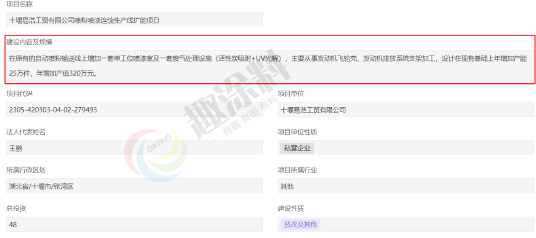 2023年5月19日,十堰易浩工貿(mào)有限公司,噴粉噴漆連續(xù)生產(chǎn)線擴(kuò)能項(xiàng)目,進(jìn)行企業(yè)投資項(xiàng)目備案。