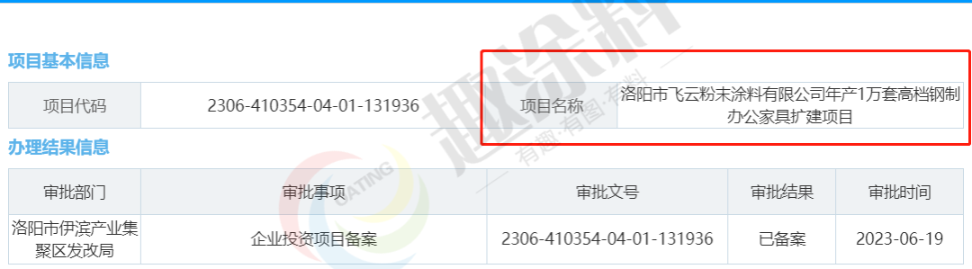 2023年6月19日,洛陽市飛云粉末涂料有限公司,年產(chǎn)1萬套高檔鋼制辦公家具擴(kuò)建項(xiàng)目,在洛陽市伊濱產(chǎn)業(yè)集聚區(qū)發(fā)改局,進(jìn)行企業(yè)投資項(xiàng)目備案。