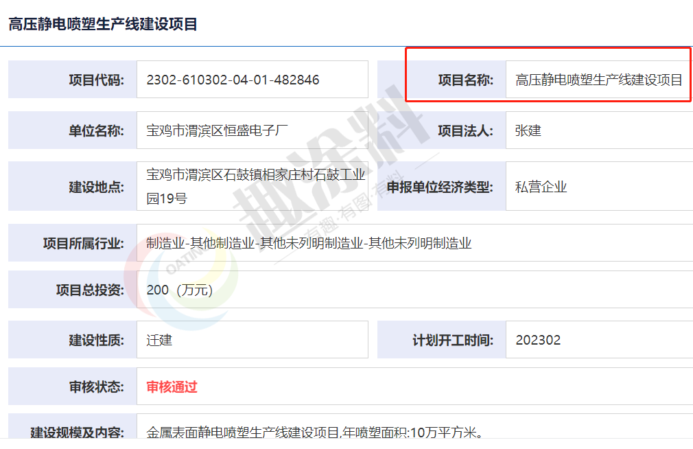 2023年2月13日,寶雞市渭濱區(qū)恒盛電子廠,高壓靜電噴塑生產(chǎn)線建設(shè)項(xiàng)目,進(jìn)行企業(yè)項(xiàng)目備案。