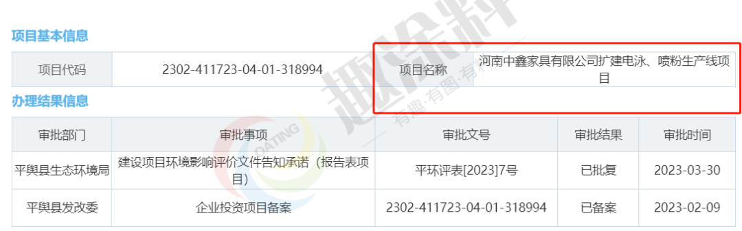 2023年2月9日,河南中鑫家具有限公司,擴(kuò)建電泳、噴粉生產(chǎn)線項(xiàng)目,在平輿縣發(fā)改委,進(jìn)行企業(yè)投資項(xiàng)目備案。