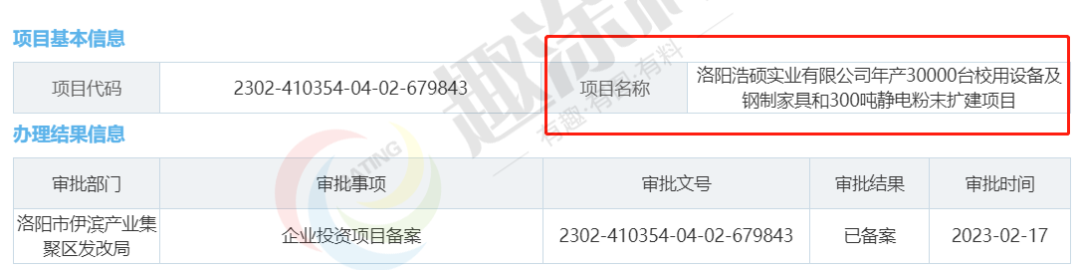 2023年2月17日,洛陽浩碩實(shí)業(yè)有限公司,年產(chǎn)30000臺校用設(shè)備及鋼制家具和300噸靜電粉末擴(kuò)建項(xiàng)目,在洛陽市伊濱產(chǎn)業(yè)集聚區(qū)發(fā)改局,進(jìn)行企業(yè)投資項(xiàng)目備案。