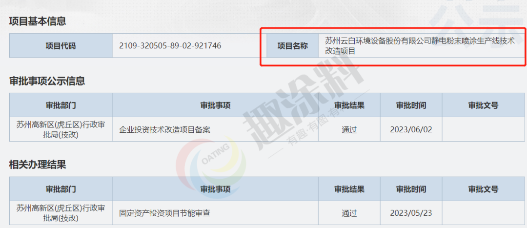 2023年6月2日,蘇州云白環(huán)境設(shè)備股份有限公司,靜電粉末噴涂生產(chǎn)線技術(shù)改造項(xiàng)目,在蘇州高新區(qū)(虎丘區(qū))行政審批局(技改),進(jìn)行企業(yè)投資技術(shù)改造項(xiàng)目備案。