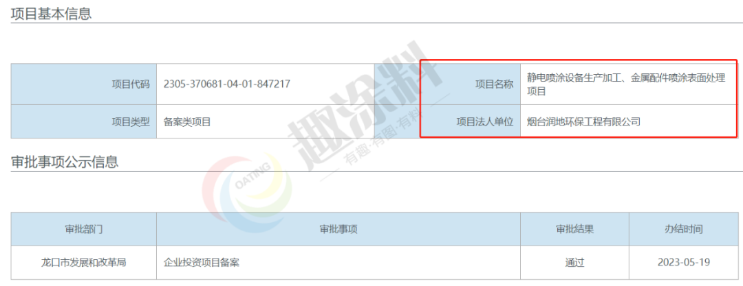 2023年5月18日,煙臺潤地環(huán)保工程有限公司,靜電噴涂設(shè)備生產(chǎn)加工、金屬配件噴涂表面處理項(xiàng)目,在龍口市發(fā)展和改革局,進(jìn)行企業(yè)投資項(xiàng)目備案。