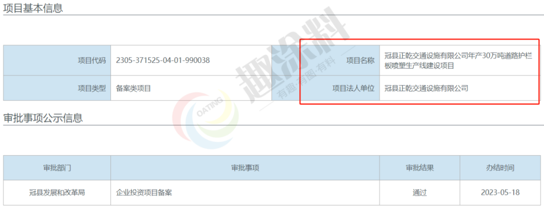2023年5月17日,冠縣正乾交通設(shè)施有限公司,年產(chǎn)30萬噸道路護(hù)欄板噴塑生產(chǎn)線建設(shè)項(xiàng)目,在冠縣發(fā)展和改革局,進(jìn)行企業(yè)投資項(xiàng)目備案。