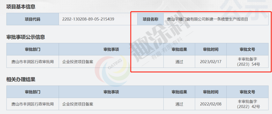 2023年2月17日,唐山宇瞳門窗有限公司,新建一條噴塑生產(chǎn)線項(xiàng)目,在唐山市豐潤區(qū)行政審批局,進(jìn)行企業(yè)投資項(xiàng)目備案。