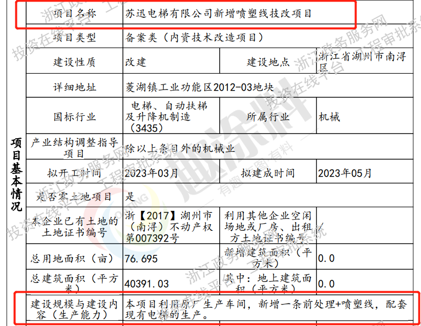 2023年1月9日,蘇迅電梯有限公司,新增噴塑線技改項(xiàng)目,在湖州市南潯區(qū)發(fā)展改革和經(jīng)濟(jì)信息化局,進(jìn)行企業(yè)投資(含外商投資)項(xiàng)目備案(技術(shù)改造)。