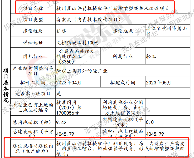 2023年3月6日,杭州蕭山許賢機(jī)械配件廠,新增噴塑線技術(shù)改造項(xiàng)目,在區(qū)經(jīng)濟(jì)和信息化局,進(jìn)行企業(yè)投資(含外商投資)項(xiàng)目備案(技術(shù)改造)。