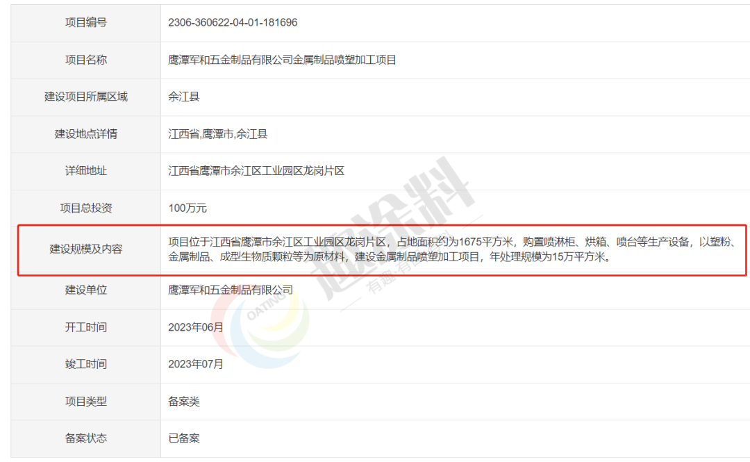 2023年6月26日,鷹潭軍和五金制品有限公司,金屬制品噴塑加工項(xiàng)目,進(jìn)行企業(yè)項(xiàng)目備案。