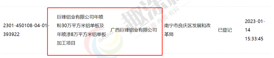 2023年1月14日,廣西巨鋒鋁業(yè)有限公司,年噴粉30萬平方米鋁單板及年噴漆8萬平方米鋁單板加工項(xiàng)目,在南寧市良慶區(qū)發(fā)展和改革局,進(jìn)行企業(yè)項(xiàng)目備案。