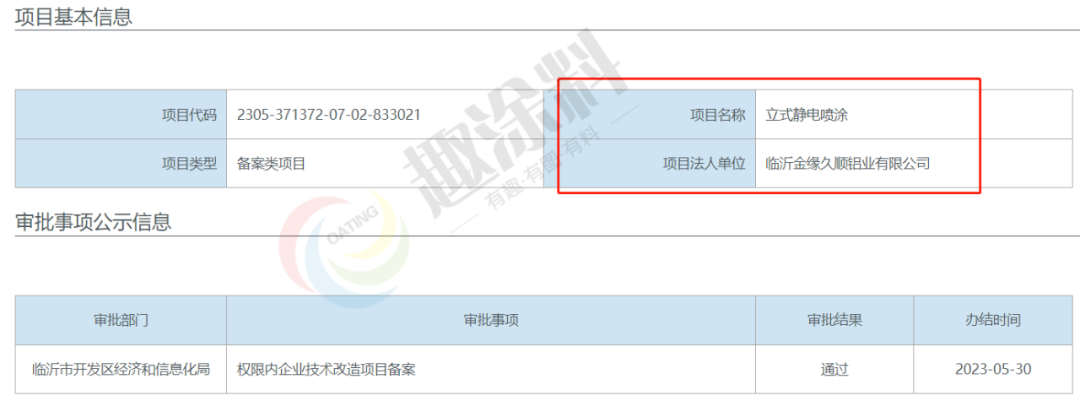 2023年5月30日,臨沂金緣久順鋁業(yè)有限公司,立式靜電噴涂,在臨沂市開發(fā)區(qū)經(jīng)濟(jì)和信息化局,進(jìn)行權(quán)限內(nèi)企業(yè)技術(shù)改造項(xiàng)目備案。