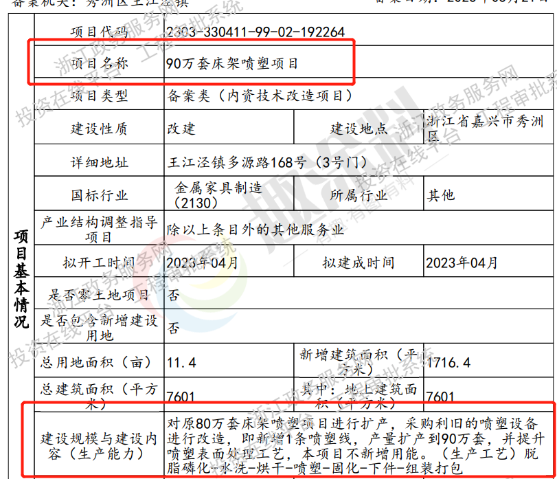 2023年3月21日,嘉興市瑞麒利家具有限公司,90萬套床架噴塑項(xiàng)目,在王江涇鎮(zhèn),進(jìn)行企業(yè)投資(含外商投資)項(xiàng)目備案(技術(shù)改造)。