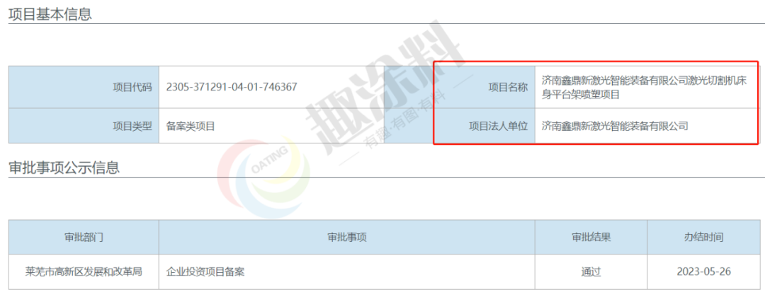 2023年5月25日,濟(jì)南鑫鼎新激光智能裝備有限公司,激光切割機(jī)床身平臺架噴塑項(xiàng)目,在萊蕪市高新區(qū)發(fā)展和改革局,進(jìn)行企業(yè)投資項(xiàng)目備案。