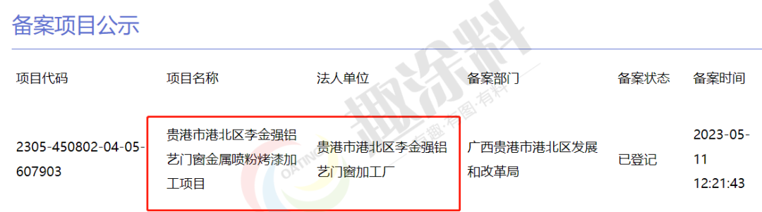 2023年5月11日,貴港市港北區(qū)李金強(qiáng)鋁藝門窗加工廠,貴港市港北區(qū)李金強(qiáng)鋁藝門窗金屬噴粉烤漆加工項(xiàng)目,在廣西貴港市港北區(qū)發(fā)展和改革局,進(jìn)行企業(yè)項(xiàng)目備案。