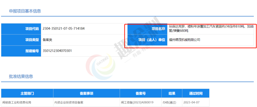 2023年4月7日,福州德茂機(jī)械有限公司,環(huán)保達(dá)克羅、噴粉年涂覆加工汽車緊固件/沖壓件810噸、加油管/彈簧680噸,在閩侯縣工業(yè)和信息化局,進(jìn)行內(nèi)資企業(yè)投資項(xiàng)目備案。