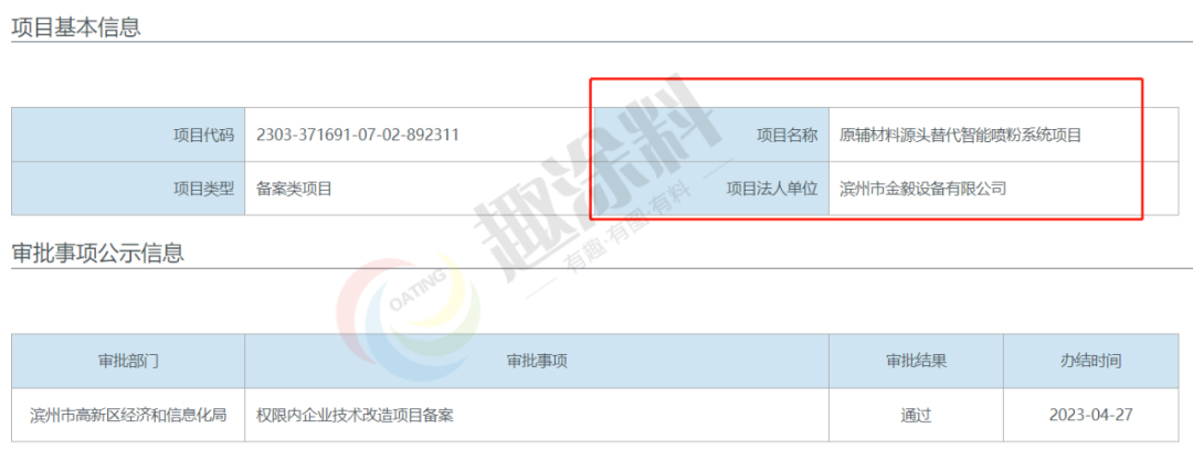 2023年3月13日,濱州市金毅設(shè)備有限公司,原輔材料源頭替代智能噴粉系統(tǒng)項(xiàng)目,在濱州市高新區(qū)經(jīng)濟(jì)和信息化局,進(jìn)行權(quán)限內(nèi)企業(yè)技術(shù)改造項(xiàng)目備案。