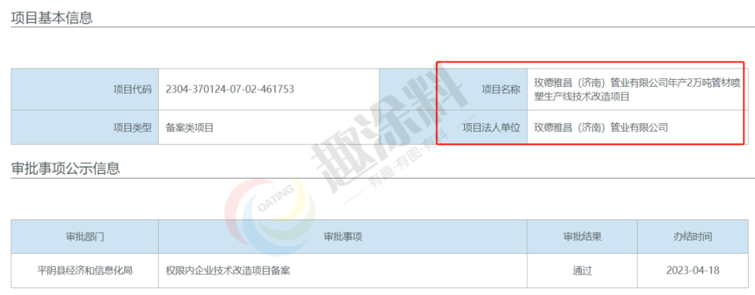 2023年4月12日,玫德雅昌(濟(jì)南)管業(yè)有限公司,年產(chǎn)2萬噸管材噴塑生產(chǎn)線技術(shù)改造項(xiàng)目,在平陰縣經(jīng)濟(jì)和信息化局,進(jìn)行權(quán)限內(nèi)企業(yè)技術(shù)改造項(xiàng)目備案。