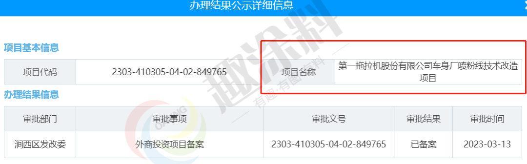 2023年3月13日,第一拖拉機(jī)股份有限公司,車身廠噴粉線技術(shù)改造項(xiàng)目,在澗西區(qū)發(fā)改委,進(jìn)行外商投資項(xiàng)目備案。
