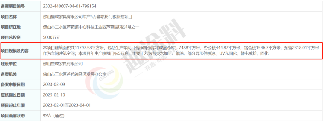 2023年2月10日,佛山星成家具有限公司,年產(chǎn)5萬套噴粉門板新建項(xiàng)目,在佛山市三水區(qū)蘆苞鎮(zhèn)經(jīng)濟(jì)發(fā)展辦公室,進(jìn)行企業(yè)項(xiàng)目備案。