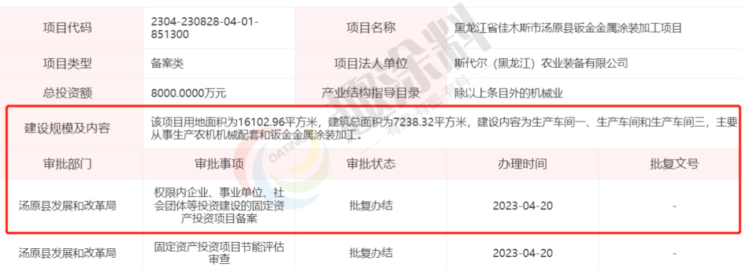 2023年4月20日,斯代爾(黑龍江)農(nóng)業(yè)裝備有限公司,黑龍江省佳木斯市湯原縣鈑金金屬涂裝加工項(xiàng)目,在湯原縣發(fā)展和改革局,進(jìn)行權(quán)限內(nèi)企業(yè)、事業(yè)單位、社會團(tuán)體等投資建設(shè)的固定資產(chǎn)投資項(xiàng)目備案。