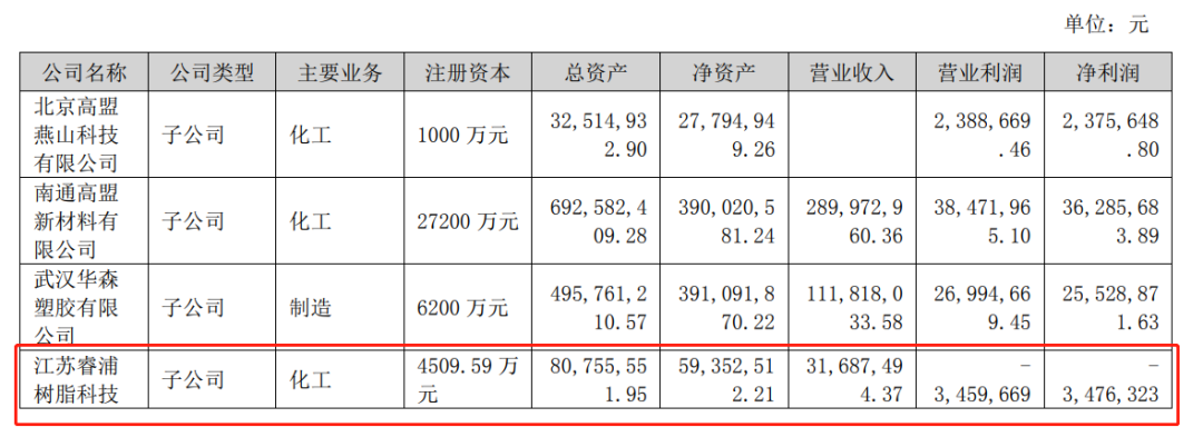 其中,旗下樹脂企業(yè)江蘇睿浦樹脂科技(下稱“江蘇睿浦”)2023年上半年實現(xiàn)營業(yè)收入3168.75萬元,實現(xiàn)凈利潤-347.63萬元。從數(shù)據(jù)上看,這個業(yè)績并不算佳。
