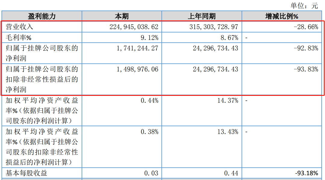 近日,安徽恒泰新材料科技股份有限公司(下稱“恒泰新科”)對(duì)外發(fā)布半年報(bào)。根據(jù)披露,2023年上半年恒泰新科營(yíng)業(yè)收入為2.25億元,同比下滑28.66%;實(shí)現(xiàn)凈利潤(rùn)174.12萬(wàn)元,同比下滑92.83%;實(shí)現(xiàn)扣非后凈利潤(rùn)149.9萬(wàn)元,同比下滑93.83%。