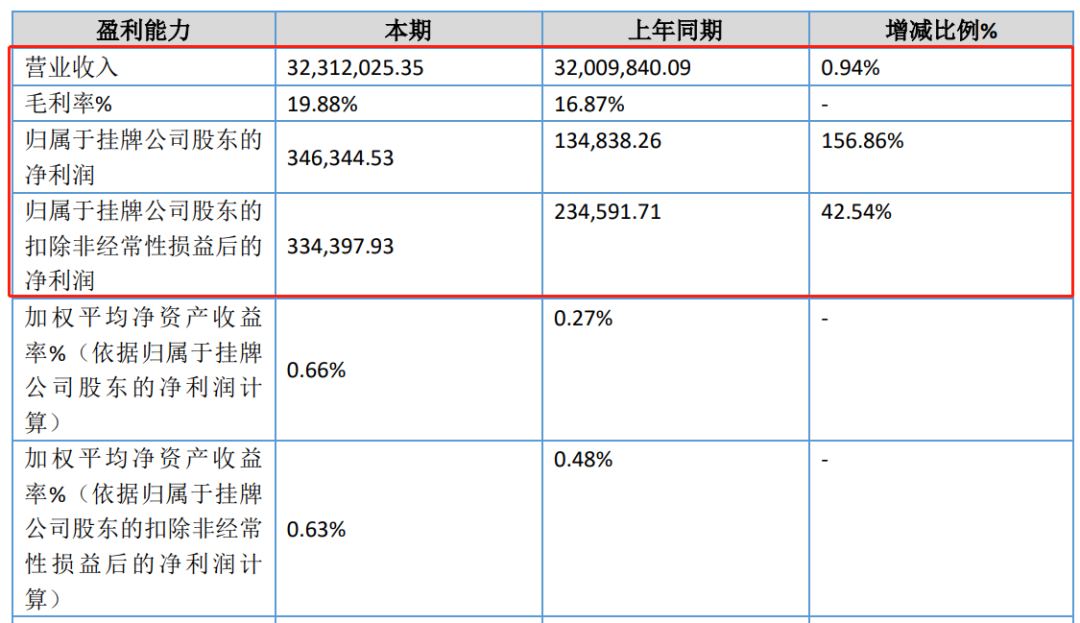 飛揚(yáng)科技2023年上半年實(shí)現(xiàn)營(yíng)業(yè)收入3231.2萬(wàn)元,同比增長(zhǎng)0.94%;實(shí)現(xiàn)凈利潤(rùn)34.63萬(wàn)元,同比增長(zhǎng)156.86%;實(shí)現(xiàn)扣非后凈利潤(rùn)33.44萬(wàn)元,同比增長(zhǎng)42.54%。