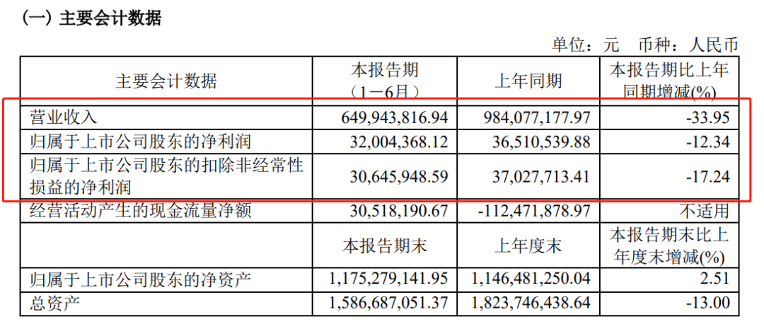 半年報顯示,上緯新材2023年上半年實現(xiàn)營業(yè)收入為6.5億元,較上年同期減少33.95%;實現(xiàn)凈利潤3200.44萬元,較上期減少12.34%;實現(xiàn)扣非后凈利潤3064.59萬元,同比減少17.24%;基本每股收益較上期減少11.11%。