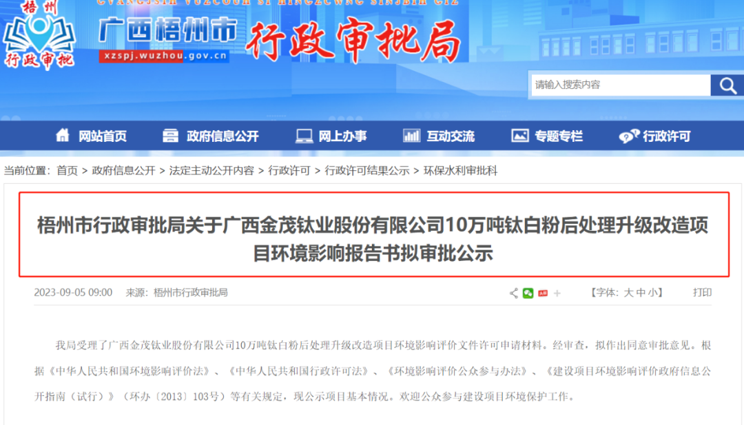 為迎合市場需求,廣西金茂鈦業(yè)股份有限公司(下稱“金茂鈦業(yè)”)擬對現(xiàn)有的10萬噸/年金紅石鈦白后處理項目進行升級改造。近日,梧州市行政審批局對外公布《關于廣西金茂鈦業(yè)股份有限公司10萬噸鈦白粉后處理升級改造項目環(huán)境影響報告書》擬審批公示。