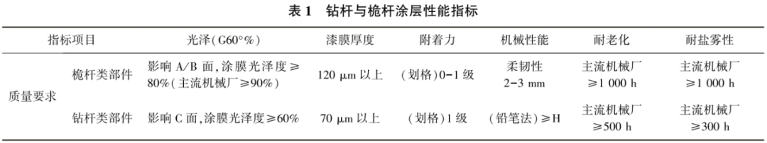 從鉆桿與桅桿粉末涂層性能指標參數(shù)可以看出,桅桿對裝飾性能及防腐性能的要求均較高,而鉆桿對裝飾性的要求不高,但防腐性能的要求較高。